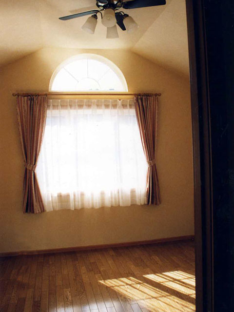 白い柱とウッドデッキが特徴のこのお宅は、アメリカのカントリースタイルを基本としました。大きなポーチ庇(ひさし)は、ウッドデッキを守るだけでなく夏の強い日差しからも室内を守ってくれます。中央についている半円窓の部屋は主寝室になっており、天井なりに屋根が高くなっていて開放感いっぱいです。