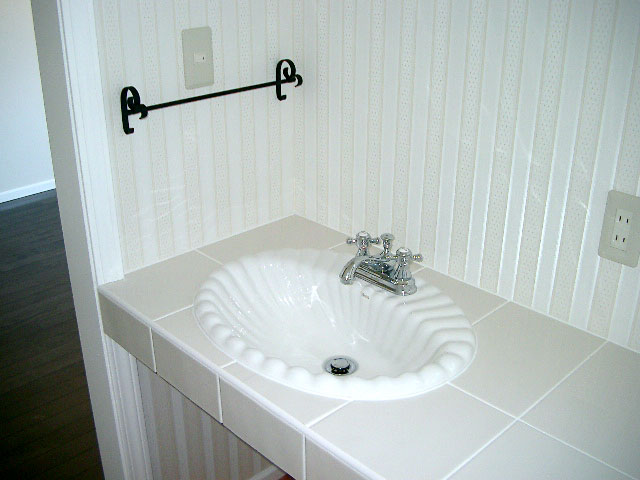 内装も、濃い色のフローリングにドアやモールの白色が引き立っており、まるでアンティークのような雰囲気を漂わせています。洗面台は既製品を置かず、タイルの天板に陶器製のボウルを埋め込み、シンプルだけど品の良い空間に仕上げました。 |