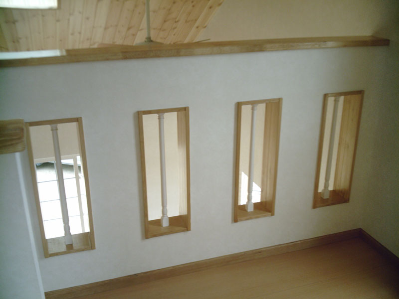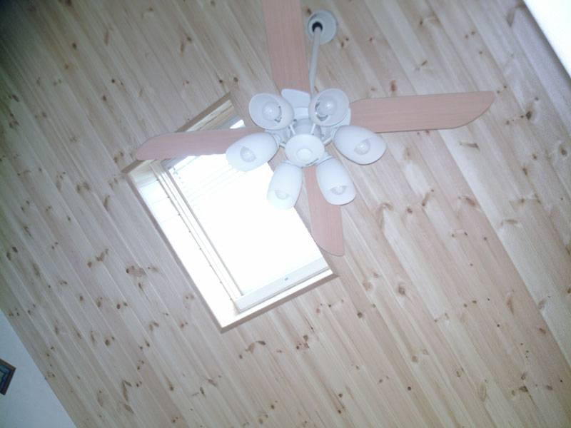 この間取りの特徴は、リビング部分の天井が屋根の形通り3m〜5.5m位の斜め天井になっている事です。斜め天井部分と腰壁にはパイン材を貼り、ナチュラル感溢れる空間に仕上げてあります。