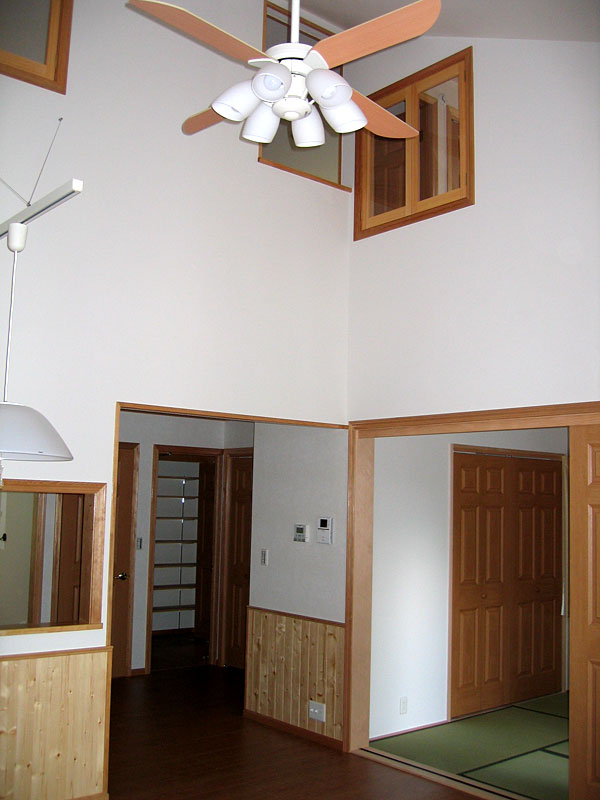 2階の寝室には星を見ながら眠る事ができるように天窓を設け、又リビングを見下ろせるように気配窓もつけてあります。オール電化や雨水を使う設備など、大自然の中でも快適に暮らせるような工夫が一杯のK様邸となりました。 |