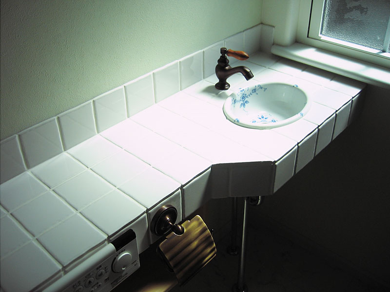 内装は、シックな濃いフローリングに白のモールをあしらうなど、外観の可愛らしさとは一味違う大人の雰囲気になっています。トイレにはタイル貼りのかわいい手洗を配し、洗面も一回り大きなアメリカ製の物をオーダーされました。