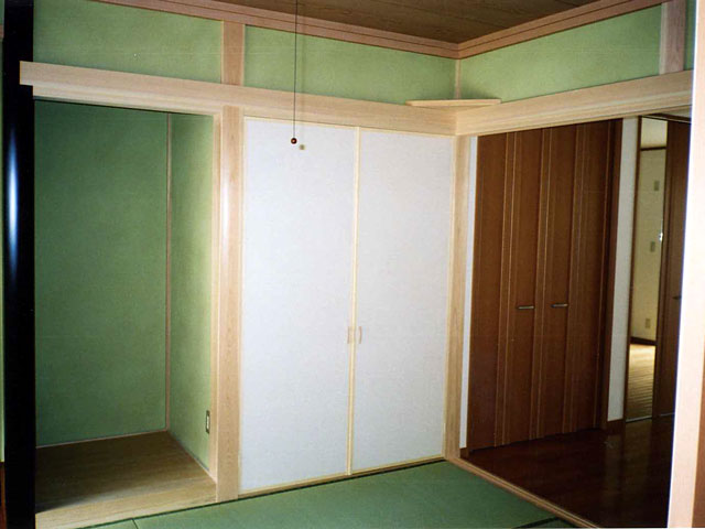 三世帯の和風住宅です。外壁はパワーボードに土色のじゅらく(繊維質とのり材を混ぜたもの)を吹付け、落ち着いた色に仕上げました。随所に棚を設け、家族7人が住むのに十分な収納を配置して